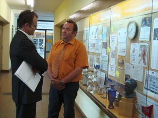 Foto 1 (oben): Michael Schierack im Gespräch mit dem Schulleiter, Herrn Käßner, vor der Glasvitrine im Max-Steenbeck-Gymnasium.