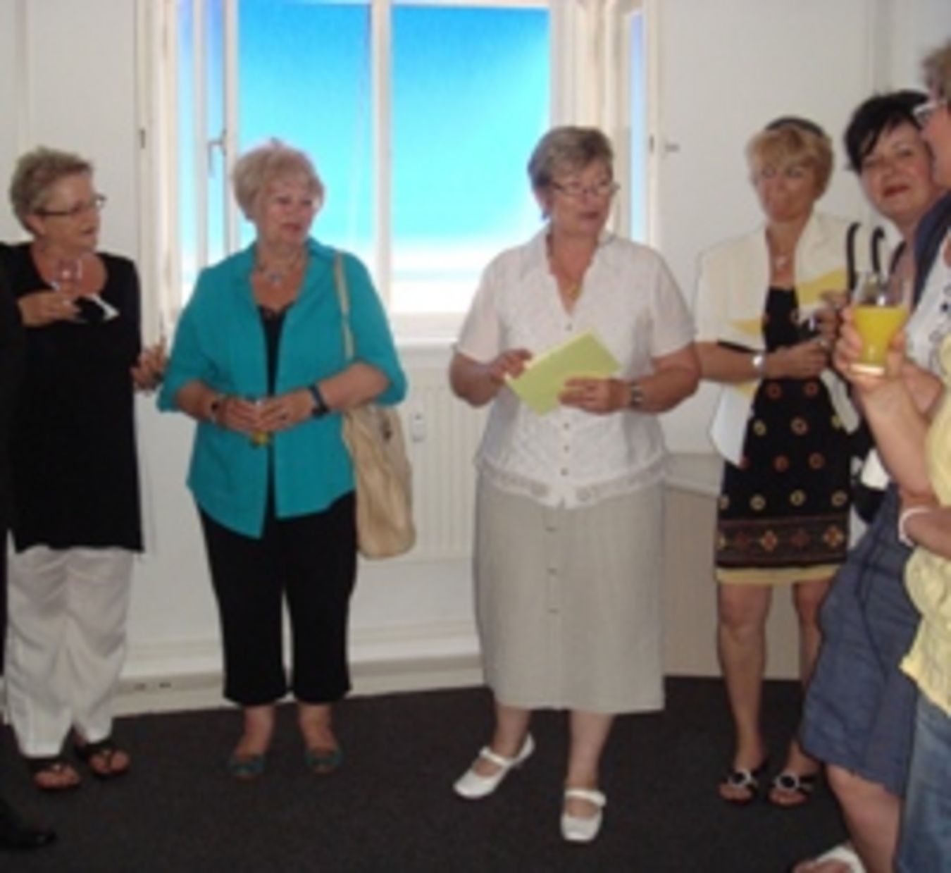 Unten: Die Geschäftsführerin vom Frauenzentrum Cottbus e.V., Frau Monika Vandreier (mitte) und Gäste bei der Eröffnungsrede.
